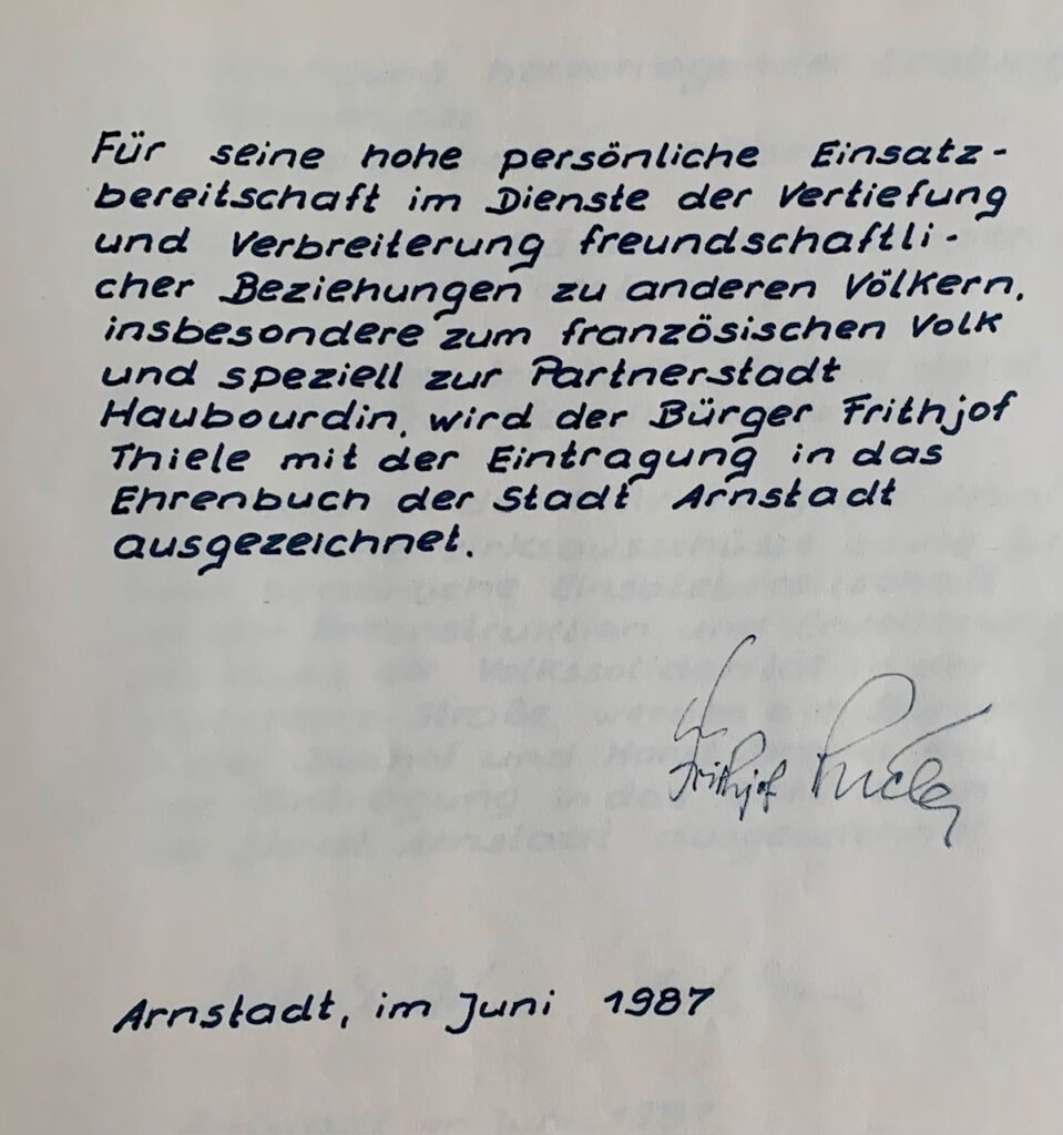 1987 war auch ein besonderes Jahr für einen anderen Mitstreiter der Partnerschaft: Frithjof Thiele. Er wurde für seine Verdienste mit der Medaille der Liga für Völkerfreundschaft in Gold ausgezeichnet und erhielt eine besondere Würdigung im Ehrenbuch der Stadt Arnstadt (nicht zu verwechseln mit dem goldenen Buch der Stadt).