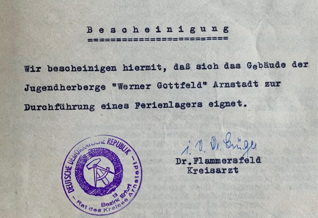 Für das kommende Jahr (1964) wurde mit der französischen Seite vereinbart, die Zahl der Ferienkinder auf 25 bis 30 zu erhöhen. Da das die Kapazität der „Singer Hütte“ überstieg, musste eine andere Unterkunft gefunden werden. Die zunächst dafür ins Auge gefasste Goldschmiedeschule im Hopfengrund stand leider nicht zur Verfügung, sodass die Jugendherberge „Werner Gottfeld“ am Bierweg (heute Sitz des DRK-Kreisverbands) ausgewählt wurde. Es kamen sogar 40 Kinder und Jugendliche aus Haubourdin und Umgebung, betreut wurden sie wieder von Frithjof Thiele und fünf seiner Schülerinnen und Schüler, diesmal aus der Abiturklasse. Als Problem erwies sich (wie im Vorjahr) die hohe Altersspanne der Gäste. Die jüngsten waren 10, die ältesten 18 Jahre alt. Die französischen Betreuer waren diesmal etwas besser vorbereitet worden, optimal war deren Rolle nach dem Abschlussbericht Thieles dennoch nicht1. Aber alle Probleme wurden irgendwie gemeistert. Das Programm ähnelte dem des Vorjahres, zusätzlich wurden Kontakte zu anderen (DDR-)Ferienlagern in und um Arnstadt sowie mit den Familien der betreuenden Schüler eingeplant. Die Vermutung, dass man die Franzosen während ihres Aufenthaltes in Arnstadt abschotten würde, bestätigen die Programme nicht. So ergaben sich zum Beispiel bei den Aufenthalten in den Schwimmbädern der Region zahlreiche Kontakte, die auch nach der Abreise weiterbestanden. Schließlich war die Neugier auf beiden Seiten groß.